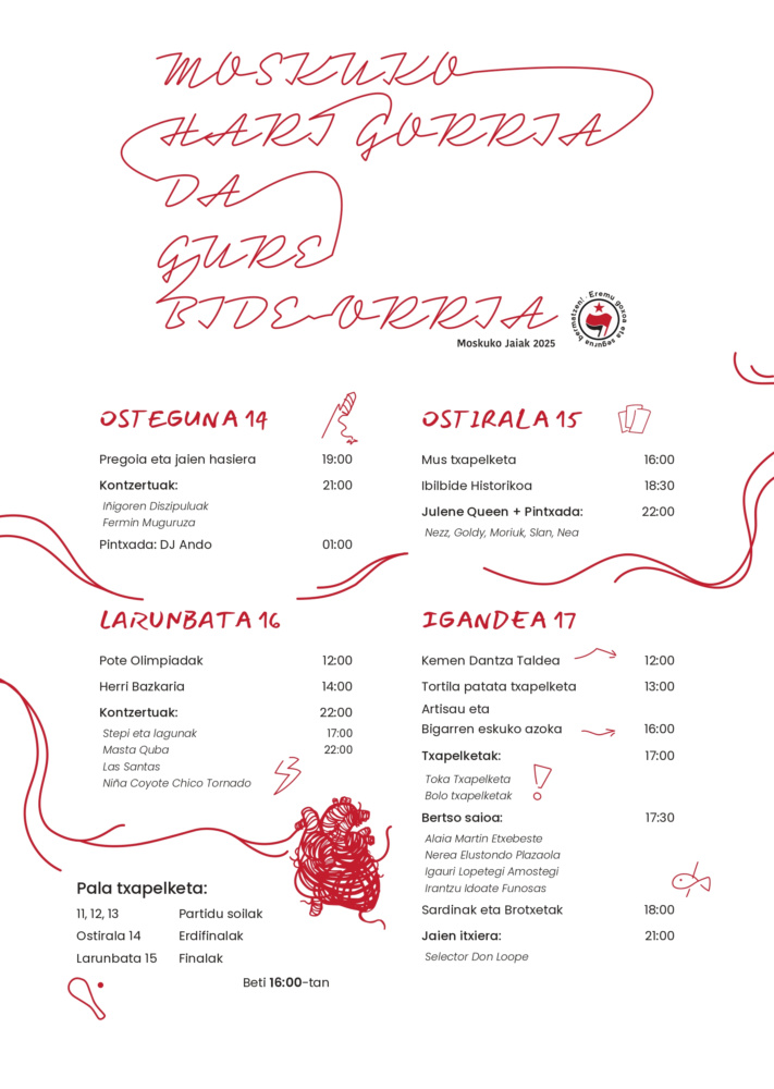 Abuztuaren 14tik 17ra ospatuko dituzte Moskuko jaiak. Jaien barnean askotariko ekintzak antolatu dituzte: kontzertuak, Herri Bazkaria, txapelketak, ibilbide historikoa, Kemenen emanaldia eta bertso saioa, besteak beste.