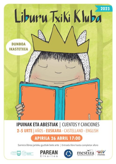 Datorren asteazkenean, apirilaren 26an, Mestiza elkarteak publiko guztiari zuzendutako “Liburu txiki kluba” saio eskainiko du Irunen. Ekintza Dunboa eskolako Haur Hezkuntzako eraikinean egingo da arratsaldeko 17:00etatik aurrera eta sarrera doakoa izango da. Plaza mugak izango dira, beraz, haurrak heldu bat edo biren laguntzarekin sartu ahalko dira.