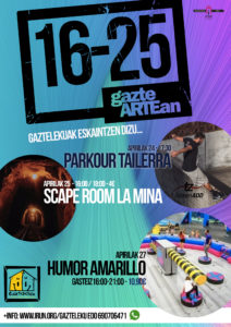 Apirilaren 17an, asteazkenean, berriz, La Mina Scape Roomera irteera egingo da. Lau orduren artean aukeratu beharko da: 10:00, 12:00, 16:00 edo 18:00 eta, ordainketa egin baino lehen, aukeratutako ordua oraindik libre dagoen kontsultatzea gomendatzen da. Lau euro ordaindu beharko dituzte ekintzan parte hartu nahi duten gazteek eta, izen-emate orriarekin batera, bankuko ordainketaren ziurtagiria entregatu beharko da gaztelekuan.