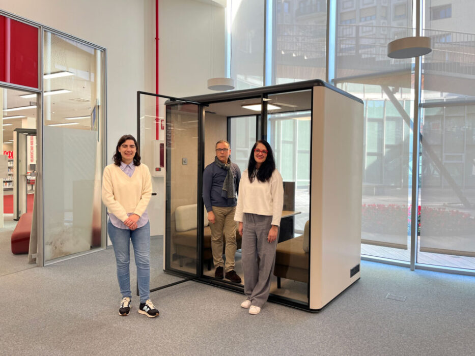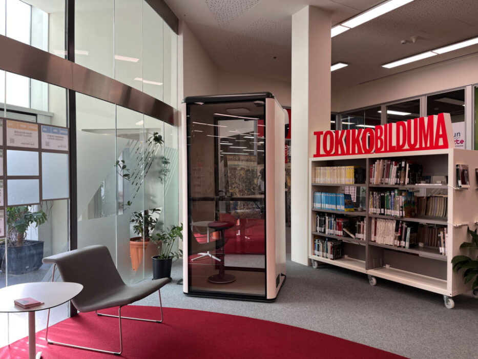Kabina hau liburutegiaren sarreran dago kokatuta, eta espazio ezin hobea da sareko bilera laburrak egiteko, telefonoz deitzeko edota beste edozein jarduera zaratatsu egiteko.