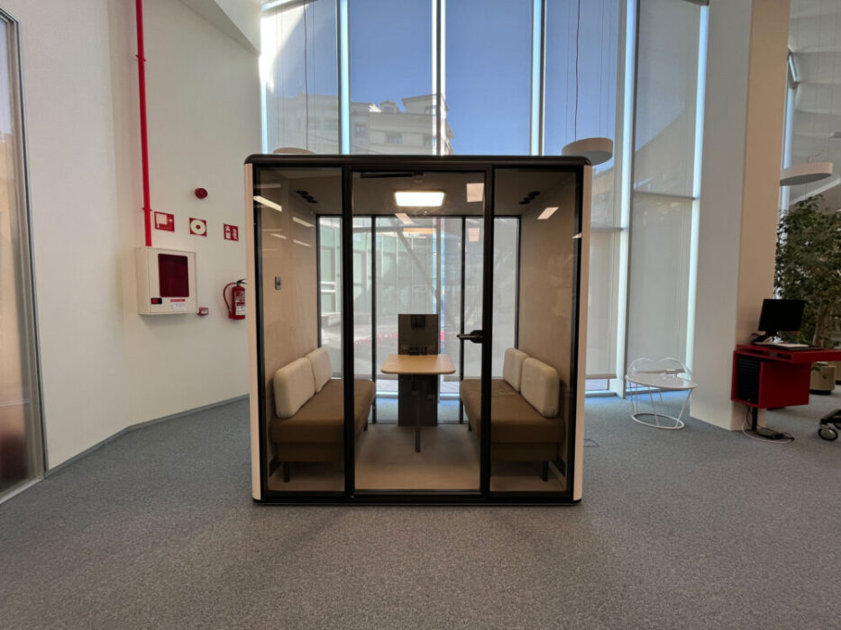 Taldeentzako zarata murrizteko kabinak monitore-euskarridun mahai bat eta bi sofa dauzka, baita elektrizitate-hargunea, haririk gabeko kargagailua, USB-A eta USB-C konexioak, LED bidezko argiztapen doigarria eta aireztatze-sistema ere.