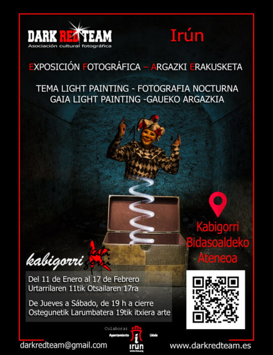Dark Red Team 2012tik gaueko argazkilaritzan eta Light Paintingean, argiarekin margotzean, espezializatutako argazki elkartea da. Modalitate honetatik hasita, tresna berriak eta estilo propioa garatzen joan dira, eta horrek erreferente izatera eraman ditu nazio mailan zein nazioartean. Elkarrizketa otsailaren 17ra arte bisitatu ahalko da Kabigorrin. Ostegunetik larunbatera, 19:00etatik itxiera arte bisitatu ahalko da erakusketa.