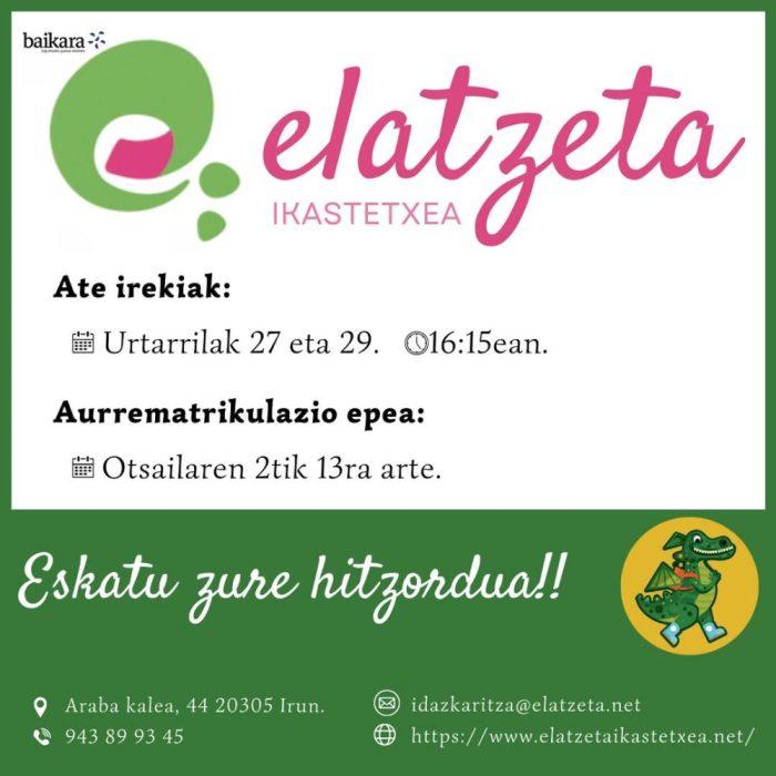 Irungo Elatzeta Ikastetxeak ate irekien jardunaldiak eta aurrematrikulazio epea iragarri ditu datorren ikasturterako. Izan ere, aurrematrikulazio epea otsailaren 2tik 13ra arte egongo da zabalik. Ikastetxeak gogorarazi du hitzordua aurretik eskatzeko aukera dagoela.