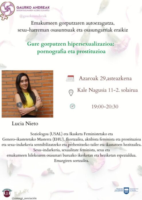 Hitzaldiak “Gure gorputzaren hipersexualizazioa: pornografia eta prostituzioa” izenburua du. Bertan, emakumeen gorputzaren autoezagutzaz, sexu-harreman osasuntsuez eta osasungarriak eraikitzearen garrantziaz mintzatuko da hizlaria.