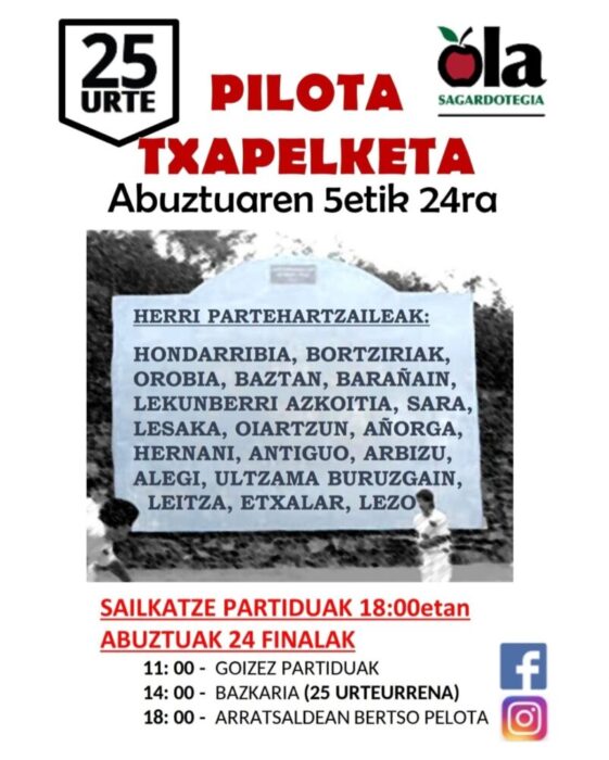 Ola Sagardotegiko XXIV. Pilota Txapelketan herri hauetako gazte pilotariek parte hartuko dute: Hondarribia, Bortziriak, Orobia, Baztan, Barañain, Lekunberri, Azkoitia, Sara, Lesaka, Oiartzun, Añorga, Hernani, Antiguo, Arbizu, Alegi, Ultzama, Buruzgain, Leitza, Etxalar eta Lezo.