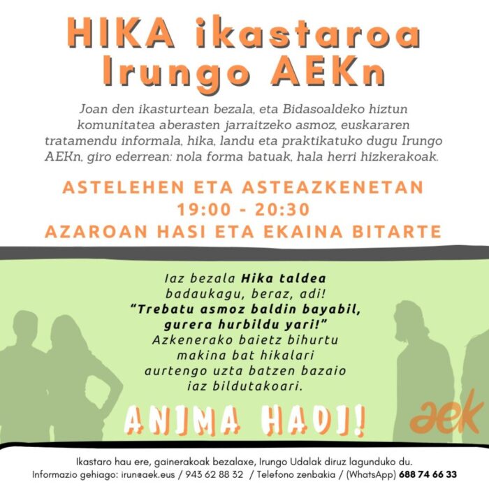Irungo AEKa Hika taldea osatzeko ikasleen bila dabil. Lau ikaslegaik izena eman dute dagoeneko Irungo AEKn Hika ikastaroan, baina beste hainbeste behar dituzte taldea aurrera atera ahal izateko.