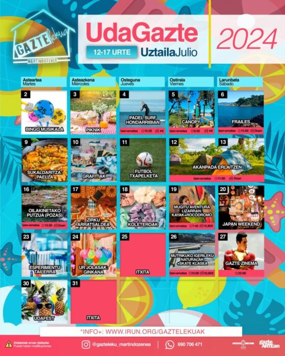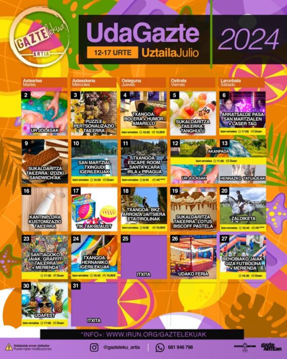 Uztailean zehar, 12 eta 25 urte bitarteko nerabe eta gazteek hainbat jardueraz gozatu ahal izango dute, hala nola mendian kanpaldia, paddle surf eta hipika eskolak, ur-motoetan esperientzia bat, Bidasoa ibaiaren jaitsiera piraguan, sakanismoa, scape room bat, sukaldaritza tailerrak eta aire zabaleko zinema-saio bat!