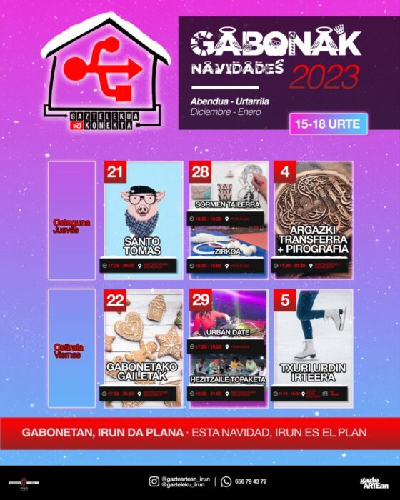 Konekta zerbitzuak Gabonak lagunartean ospatzeko ekintzak antolatu ditu. Ekintza berezi horiek abenduko eta urtarrileko ostegunetan eta ostiraletan egingo dira, abenduaren 21etik urtarrilaren 5era. Proposatutako ekintzak 15 eta 18 urte arteko gazteentzat dira.