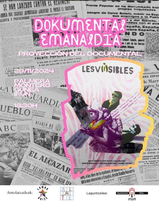 Lumak Haize, Irungo LGTBIAQ+ elkarteak, dokumental emanaldia antolatu du azaroaren 29rako, datorren ostiralerako. Lesvisibles Aldartek sortutako dokumentala proiektatuko dute Irungo Palmera Montero gunean 18:30ean. Elkartetik jakinarazi dutenez, ekitaldirako sarrera librea izango da.