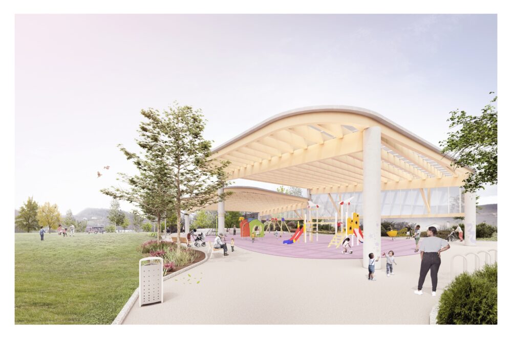 Hiru eraikuntza elementu proposatu dira. Forma errektangularrak eta ertz biribilduak izango dituzte, eta bata bestearen gainean egongo dira, konposizio kateatu txiki bat eratuz. Bi elementurik handienak altuera desberdineko bi estalki izango dira, eta bestea, plataforma bat, jolaserako elementu gehigarriarena eta estalpean egoteko tokiarena egin dezakeena. Estalpeko eremuaren azalera 486 m2 inguru izango da. Bi estalkiak hormigoizko sei zutaberen gainean egongo dira, eta zutabeek zurezko egitura bati eutsiko diote; horrela, jolastoki diafano eta zabal bat eratuko da. Estaldura izpi ultramoreetatik babestutako polikarbonato gardenezkoa izango da, eta aluminiozko profilduna, eta bi mailatan banatuta egongo da, giro desberdinak sortzeko, aireztapen naturalari bide emateko eta haizearen bultzada negatiboa txikitzeko.