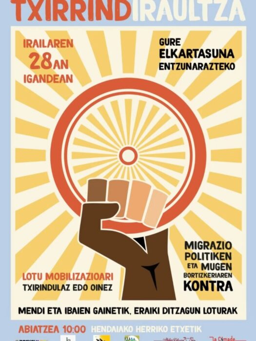 Irailaren 28an, Txirrindiraultza mobilizazioa egingo da, migrazio politiken eta mugen bortizkeria salatzeko. Ekimena Recycl´arte, Irungo Harrera Sarea, J´accuse, Bidasoa etorkinekin, Atelier Vélo Txirrind´ola eta La Cimade elkarteek elkarlanean antolatu dute, eta helburu nagusia elkartasuna entzunaraztea da. Martxaren leloa “Mendi eta ibaien gainetik, eraiki ditzagun loturak” da. Parte hartzeko bi modu izango dira: bizikletan edo oinez.